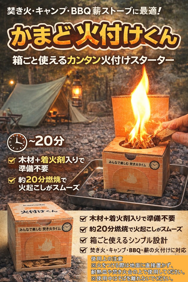 焚き火の火起こし、もう失敗しない。 「かまど火付けくん」は箱ごと火をつけるだけで、 約20分安定して燃え続ける火付けスターターです。 木材と着火剤がセットになっているので、 面倒な準備は一切不要。 初心者でも簡単に焚き火・BBQ・薪ストーブの火起こしができます。 焚き火3回分セット(3個入り)・送料無料 火起こしの失敗や時間ロスを防ぎ、 安心して焚き火を楽しめます。 火が安定するまでしっかり燃えるため、 途中で消える心配がありません。 薪を組むのが苦手な方や、お子さまと一緒の焚き火にもおすすめです。 ※火をつける際は地面に直接置かず、 耐熱皿や焚き火台の上で使用してください。 ※使用中はその場を離れないでください。